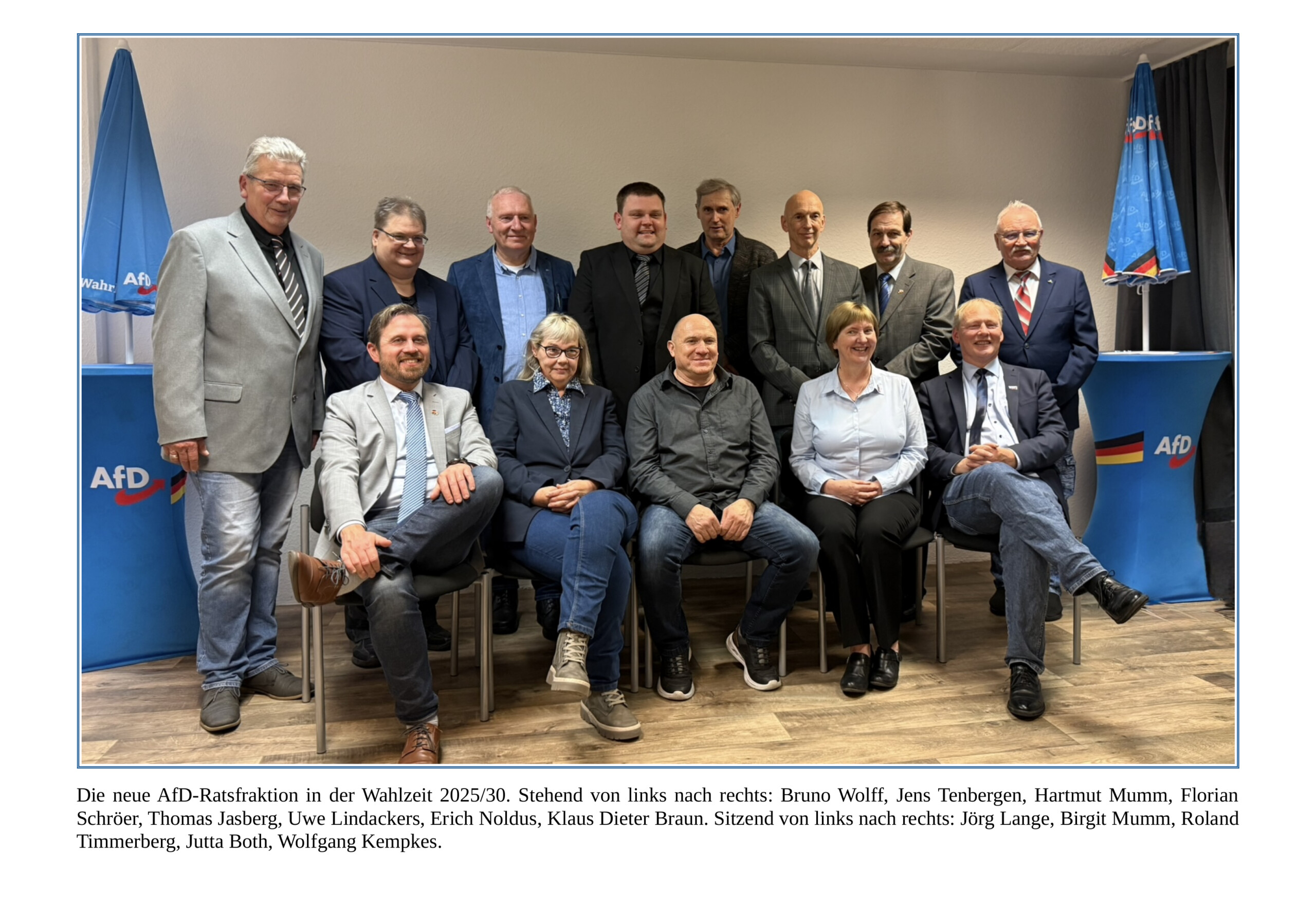 Die neue AfD-Fraktion besteht aus den gewählten Ratsmitgliedern Wolfgang Kempkes (Fraktionsvorsitzender) Hartmut Mumm (stellv. Fraktionsvorsitzender) Erich Noldus (Fraktionsgeschäftsführer) Jörg Lange, Birgit Mumm, Bruno Wolf, Jens Tenbergen, Jutta Both, Uwe Lindackers, Klaus Braun, Roland Timmerberg und Thomas Jasberg.